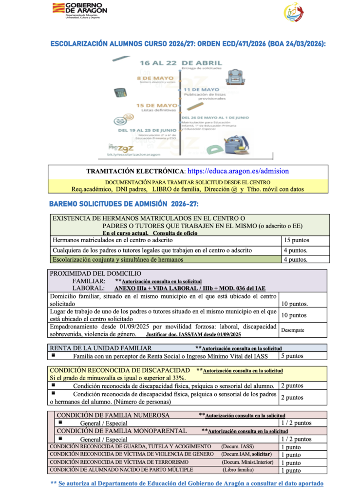 Admisión del alumnado Inicio / Servicios | Trámites / Proceso de Admisión El plazo de presentación de solicitudes para la escolarización en las enseñanzas de educación infantil y primaria del próximo curso 2026-2027 será desde las 9 h. del 16 de abril hasta las 14 h. del 22 de abril. TRAMITACIÓN ELECTRÓNICA BAREMO SOLICITUDES